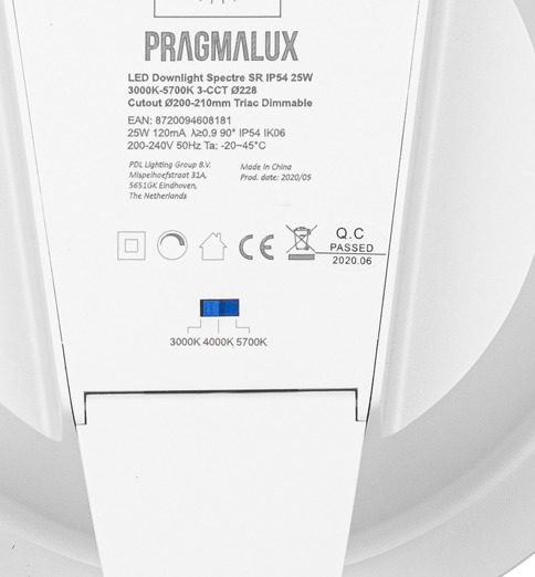 Pragmalux LED Downlight Spectre SR IP54 10-25W 3000K-5700K 3-CCT 1150-2750lm Ø228 Buitenmaat - Gatmaat Ø200-210 +Universele LED Driver (DALI2, 1-10V, Push-dim) (2x26W)