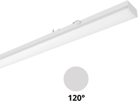 PRX LED-Lichtlijnmodule compatible met bestaande draagrails van lichtlijnsystemen van Signify Philips Maxos G1, TTX400, TTX200, Veko, Norton T5/T8, Lumis, Trilux E-Line T8E, T5E, Regiolux SMT, SDT, Siteco, Zumtobel ZX2. Geschikt voor gebruik in HACCP, IFS versie 6 en/of BRC Global Standard Food versie 7 gecertificeerde bedrijven (DIN 10500). Gereedschapsloos aan het draagprofiel te bevestigen met behulp van roestvrijstalen kliksluitingen. Met mechanische beveiliging tegen verkeerde montage. Bij correcte montage vormt het LED Armatuur één geheel met de draagrail. Het optisch systeem bestaat uit een lenzenoptiek van PMMA met drie op elkaar afgestemde, lichttechnisch werkzame zones, wat een gelijkmatige lichtverdeling en homogene lichtuitstraling garandeert. Stralingskarakteristiek: Zeer brede bundel 120° (Very Wide Beam/VWB), Breedstralend 90° (Wide Beam/WB), Middelbrede Bundel 60° (Middle Beam/ MB), Smalle bundel 30° (Narrow Beam/NB). Aanbevolen installatiehoogte: 4 – 12m. Armatuurfamilie standaard voorzien longlife 100.000 uur drivers met dipswitch schakelaar, waarmee 4-in-1 wattages en lichtstromen ingesteld kan worden (multilumen). Armatuurlichtstroom tussen 4.880 tot 9.150lm, aansluitvermogen 32,00W tot 60,00W. Verkrijgbaar in lichtkleur 3000K (warm wit), 4000K (neutraal wit), 5000K (koud wit) of 6500K (daglicht). Maximum efficacy 153 lm/w. Algemene kleurweergave-index (CRI) Ra >80. Zeer stabiele binning MacAdam Ellipse =2 (SDCM). Gemiddelde levensduur L90(tq 25°C) = >50.000, L80(tq 25°C) = >100.000 volgens TM-21 extrapolatie, In-SITU temperatuurtest (ISTMT). Toelaatbare omgevingstemperatuur (ta): -25°C ~ + 50°C. Beschermklasse (EN 61140): I. Beschermklasse Ingress Protection (EN 60529): IP40, slagvastheid IEC 62262: IK02. Beoordeling van de gevaren van blauw licht (EN 62471): RG1 , geen risico. Gloeidraadtest conform IEC 606952-11: 650°C. Met elektronische transformator, origineel aansluitklem/ connector per merk. Versies met DALI, en voorzieningen voor de aansluiting van lichtmanagement systemen op basis van DALI. Noodverlichting manuele of autotest, continue, niet-continue, noodverlichting als standbyverlichting. Armaturen voldoen aan de fundamentele eisen van de van toepassing zijnde EU-richtlijnen en productveiligheidswet, zoals EMC, LvD en RoHs. Armaturen zijn voorzien van een CE-markering en ENEC-keuring.