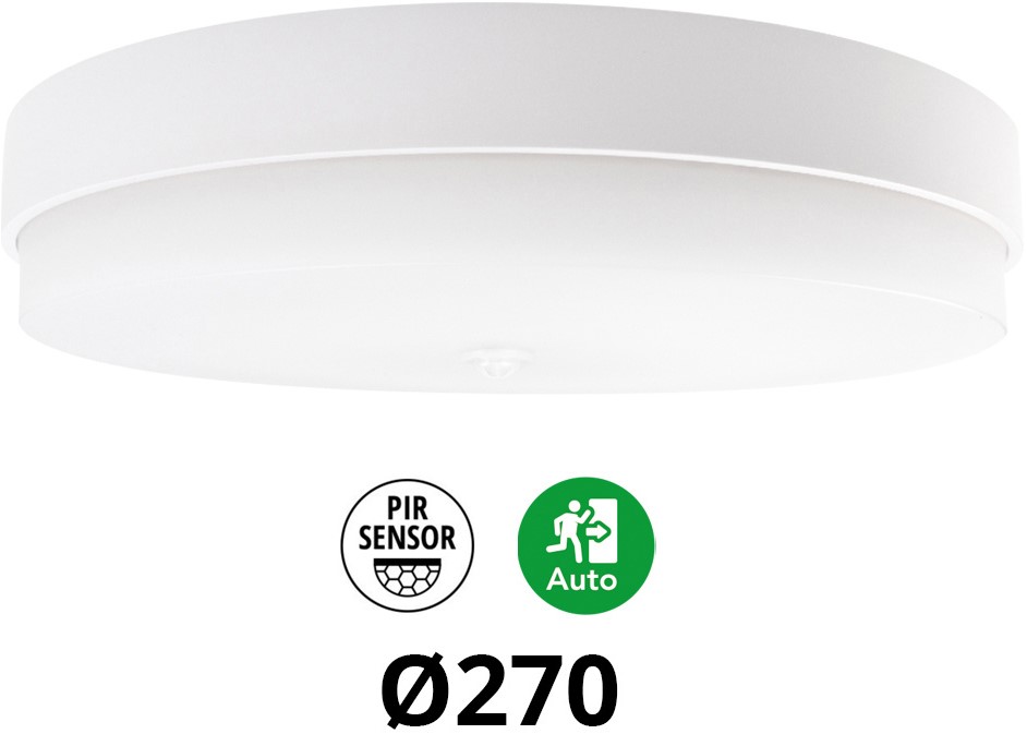 Ronde wand- of opbouwarmatuur met opalen kap, gemaakt van Polycarbonaat voor gebruik in binnenruimten. Met ronde diffuser. Beschikbaar in diameters (mm) van 270 en 340. Beschikbaar in 2 kleuren wit (RAL9003), zwart (RAL9004). Opbouwdiepte 63mm. Armatuurbehuizing uit UV-gestabiliseerd polycarbonaat vlamdovend. Armatuurlichtstroom via interne schuifschakelaar in te stellen tussen 375-1100lm voor 270 en 750-2300lm voor 340 , aansluitvermogen 4-9W 270 en 8-18W 340, multilumen (4-in-1) met lichtrendement tot 132 lm/W. Lichtkleur 2-in-1 (2-CCT) 2200K (amber extra warm), 2700K (extra warmwit) of 3-in-1 (3-CCT) 3000K, 3500K (warmwit) 4000K (neutraal wit) gereedschaploos instelbaar via schuifschakelaar op PCB. Versies met reguliere 220-220V spanning en 24V-42V AC/DC, DALI2 driver, dimbare sensor (step-dim), beweging prioriteit RF, aanwezigheidsprioriteit PIR, schemerdaglichtprioriteit en/of gentegreerde noodvoorziening conform EN-1838. Modulair uit te breiden met master-slave. Algemene kleurweergaveindex (CRI) Ra >80. Zeer stabiele binning MacAdam Ellipse 3 (SDCM). Gemiddelde levensduur L90(tq 25C) = 54.000 volgens TM-21 extrapolatie, In-SITU temperatuurtest (ISTMT). Toelaatbare omgevingstemperatuur (ta): -20C ~ + 45C, met nood, en/of nood-sensor -10C ~ + 40C. Beschermklasse (EN 61140): II. Beschermklasse Ingress Protection (EN 60529): IP64, slagvastheid IEC 62262: IK10. Gloeidraadtest conform IEC 60695-2-11: 850C. Met elektronische transformator. Met 3-aderige / 5-aderige aansluitklem voor bedrading tot 2,5m voor aansluiting en doorlussen (loop-in-loop-out) van voeding. Geschikt voor centraal- en hollewanddozen. Met zijdoorvoer M20. Armaturen voldoen aan de fundamentele eisen van de van toepassing zijnde EU-richtlijnen en productveiligheidswet, zoals EMC, LvD en RoHs. Armaturen zijn voorzien van een CE-markering.
