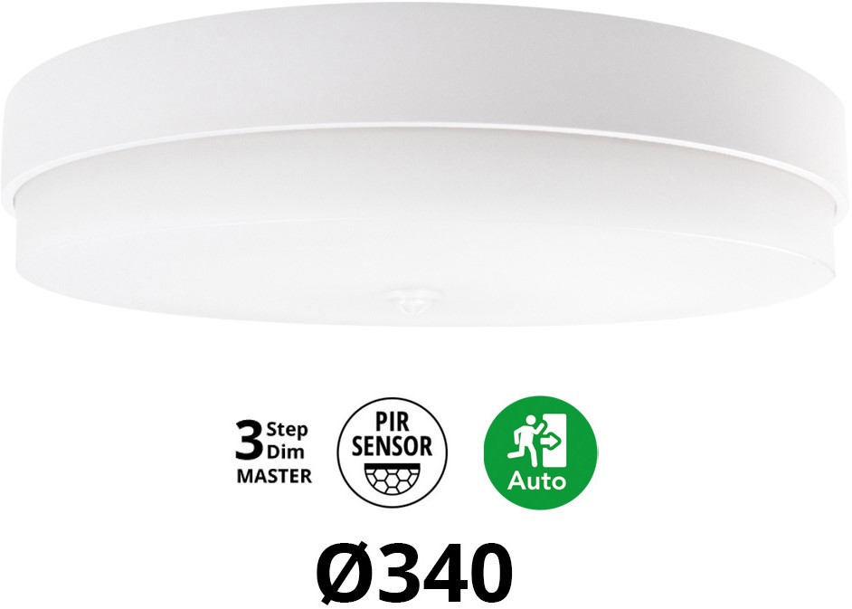 Pragmalux LED Plafonnière / Wandarmatuur Dura-M Wit Ø340 IP64 IK10 8-18W 950-2300lm 3000K-3500K-4000K 3-CCT 3-step dim (100-10%) master + PIR Sensor& noodmodule 1uur zelftest