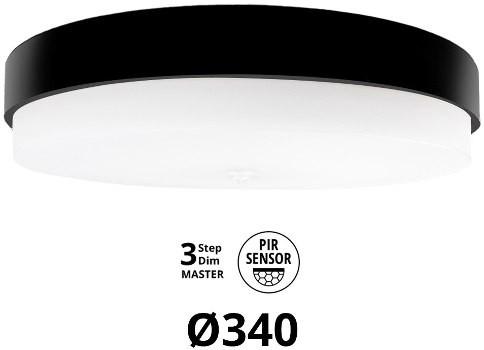 Pragmalux LED Plafonnière / Wandarmatuur Dura-M Zwart Ø340 IP64 IK10 8-18W 950-2300lm 3000K-3500K-4000K 3-CCT 3-step dim (100-10%) master + PIR Sensor