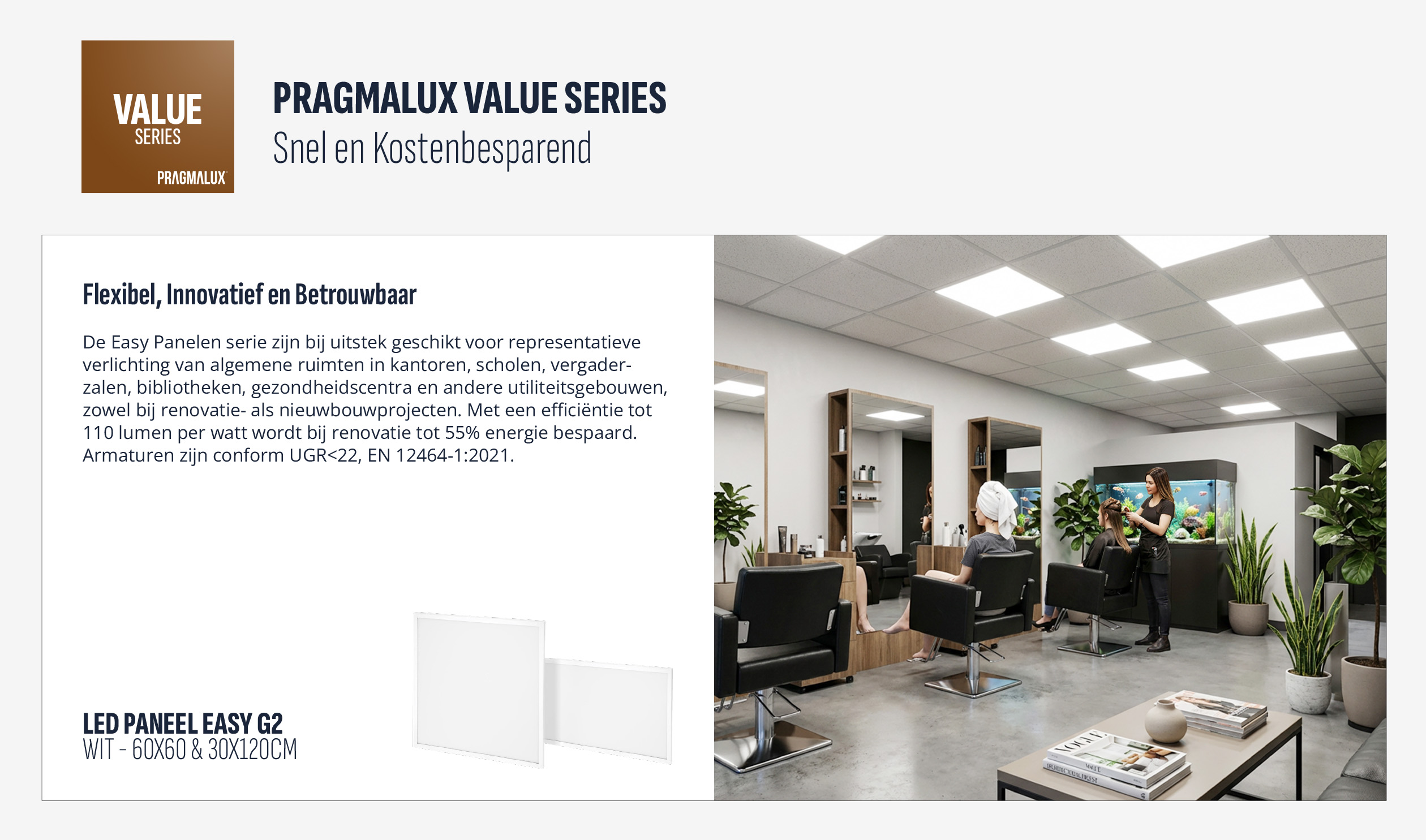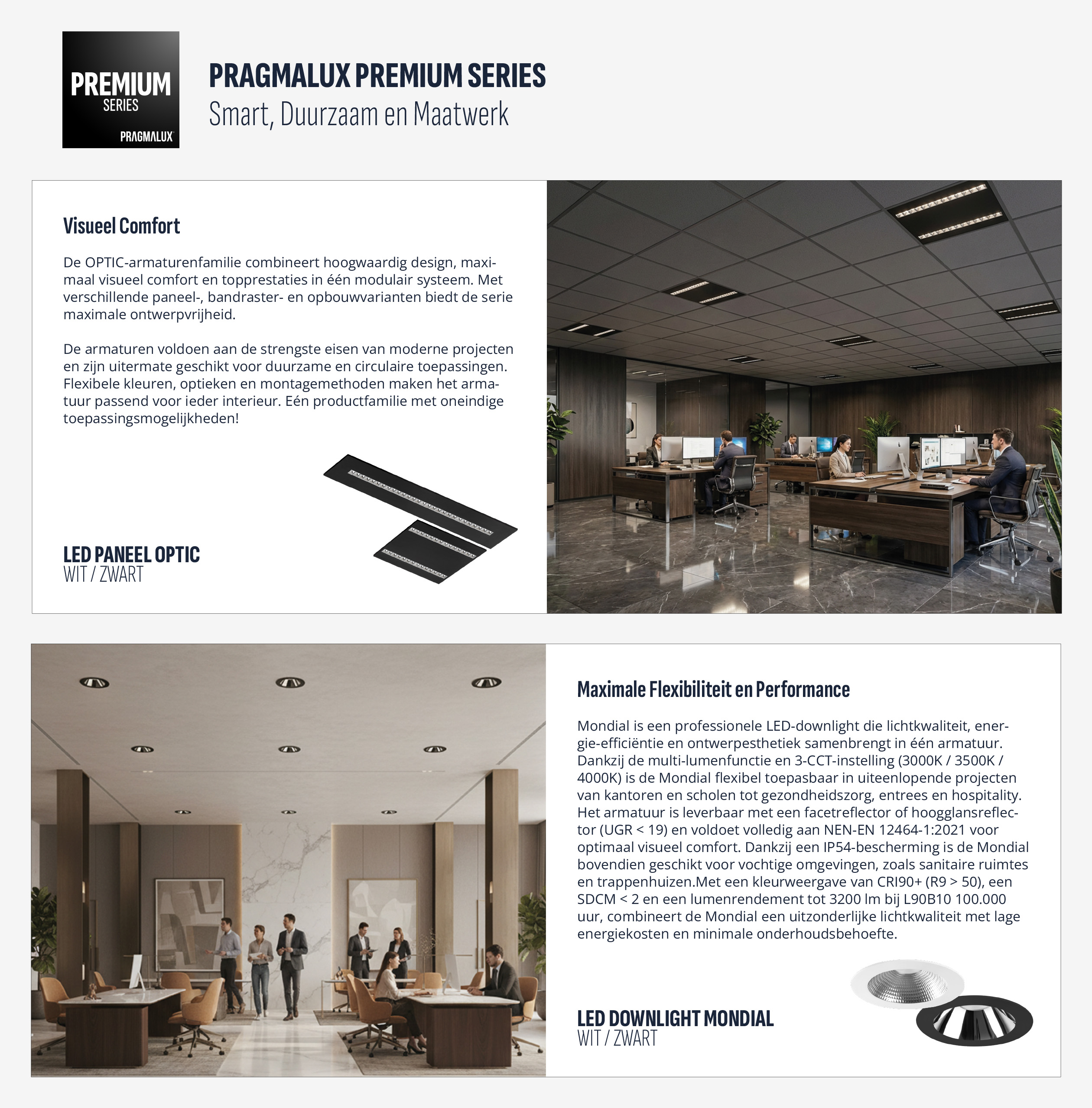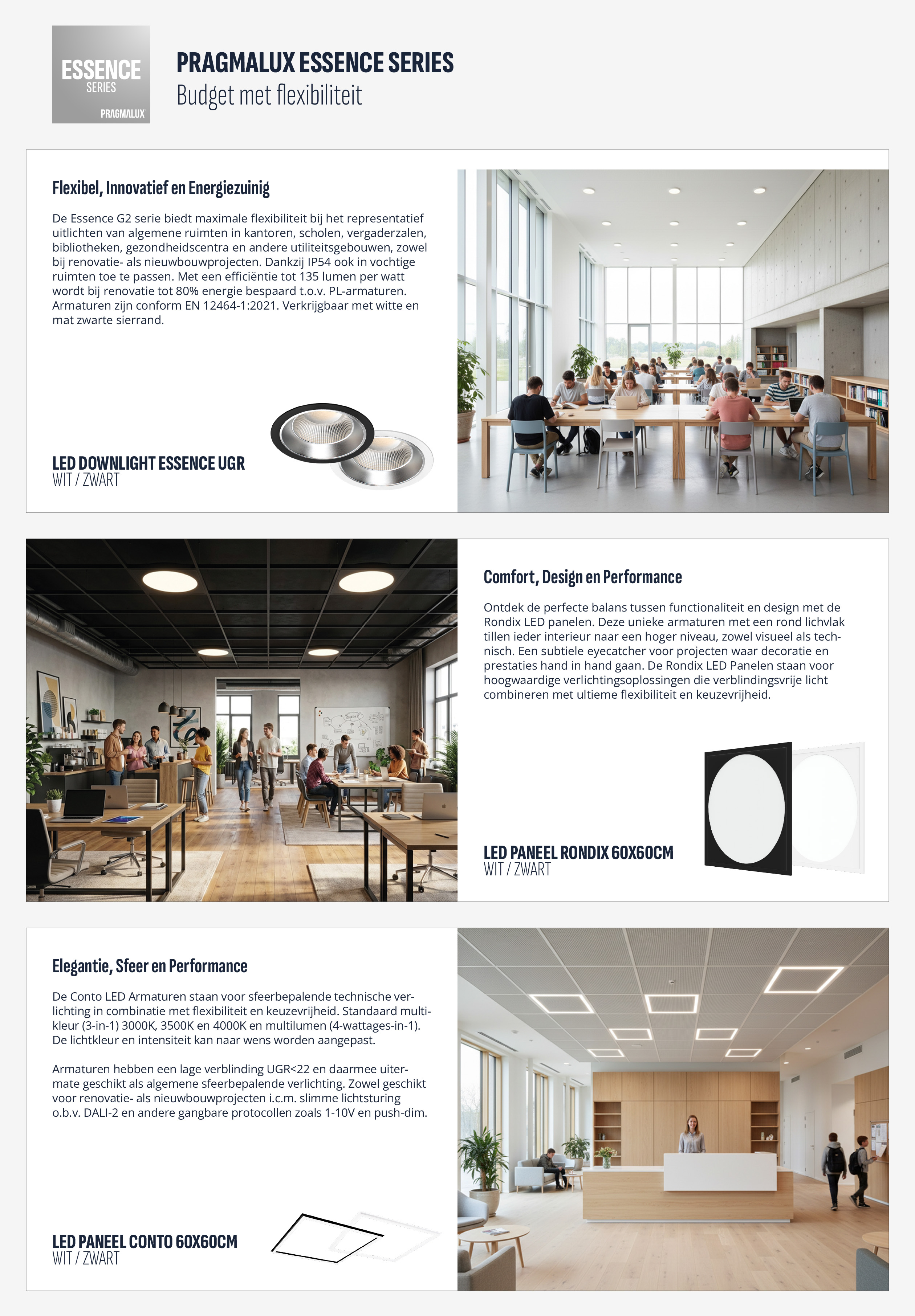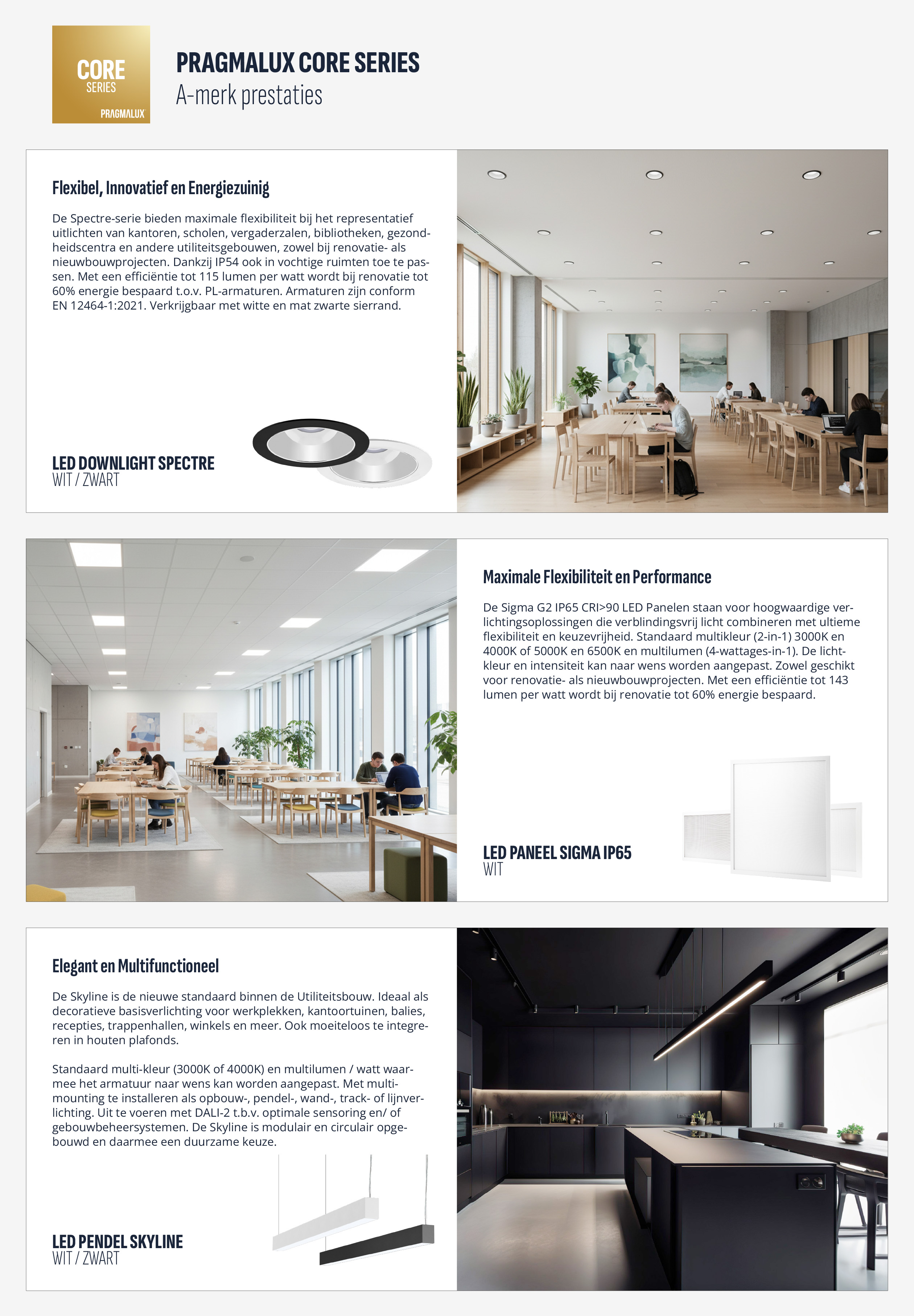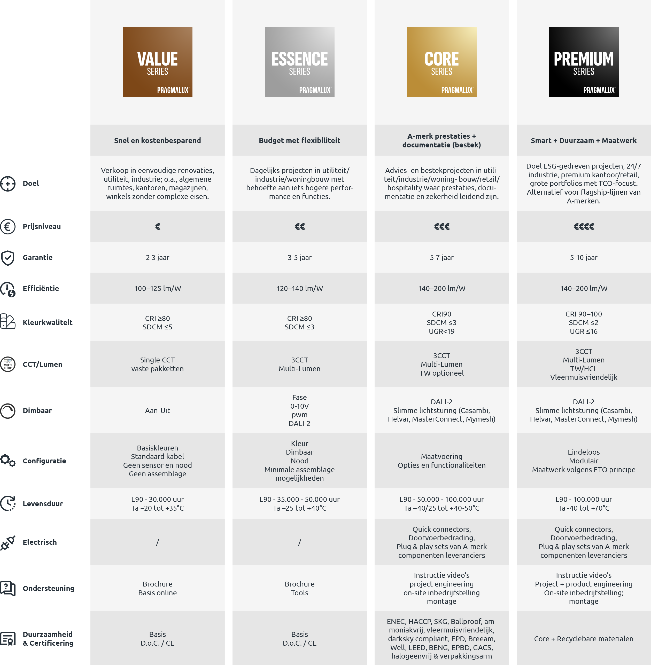 De Pragmalux Product Series is ontwikkeld om ontwerpvrijheid en specificatiezekerheid te combineren binnen een helder gestructureerd portfolio. Voor projecten waarin efficiëntie en doorlooptijd leidend zijn, biedt Value een solide basis met betrouwbare prestaties en een scherpe positionering. Essence voegt daar extra flexibiliteit, lichtkwaliteit en toepassingsbreedte aan toe, ideaal voor utiliteitsbouw, kantoren en renovaties waar functionaliteit en comfort samenkomen. Core richt zich op professioneel gespecificeerde projecten met uitgebreide technische documentatie, geavanceerde opties en ondersteuning voor bestek- en adviestrajecten. Premium is ontwikkeld voor hoogwaardige, duurzame en langdurige toepassingen waarin prestaties, esthetiek en maatwerk centraal staan.